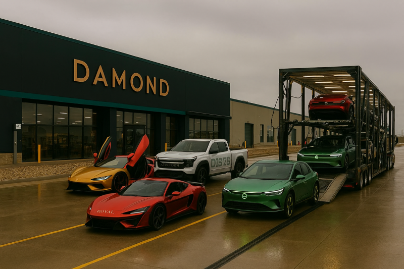 • Dealership signage — “DAMOND” in bold gold letters on the building